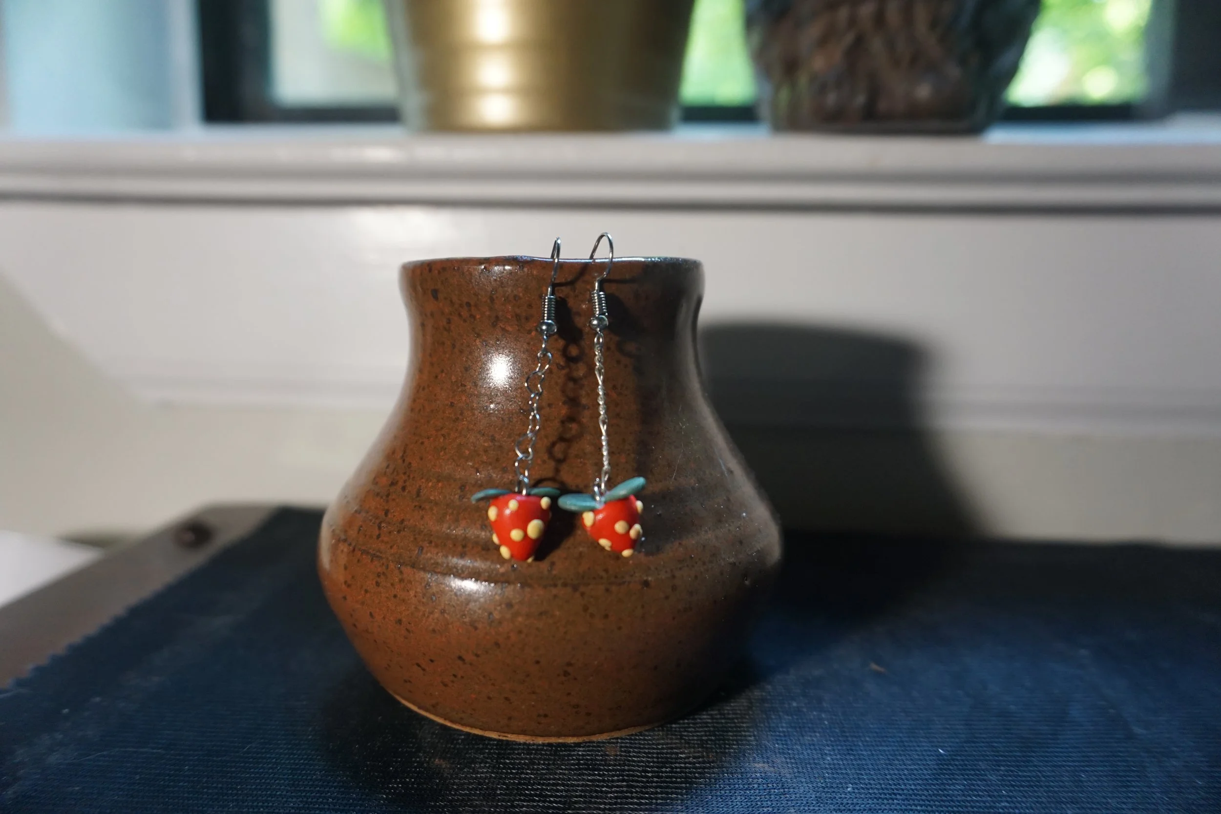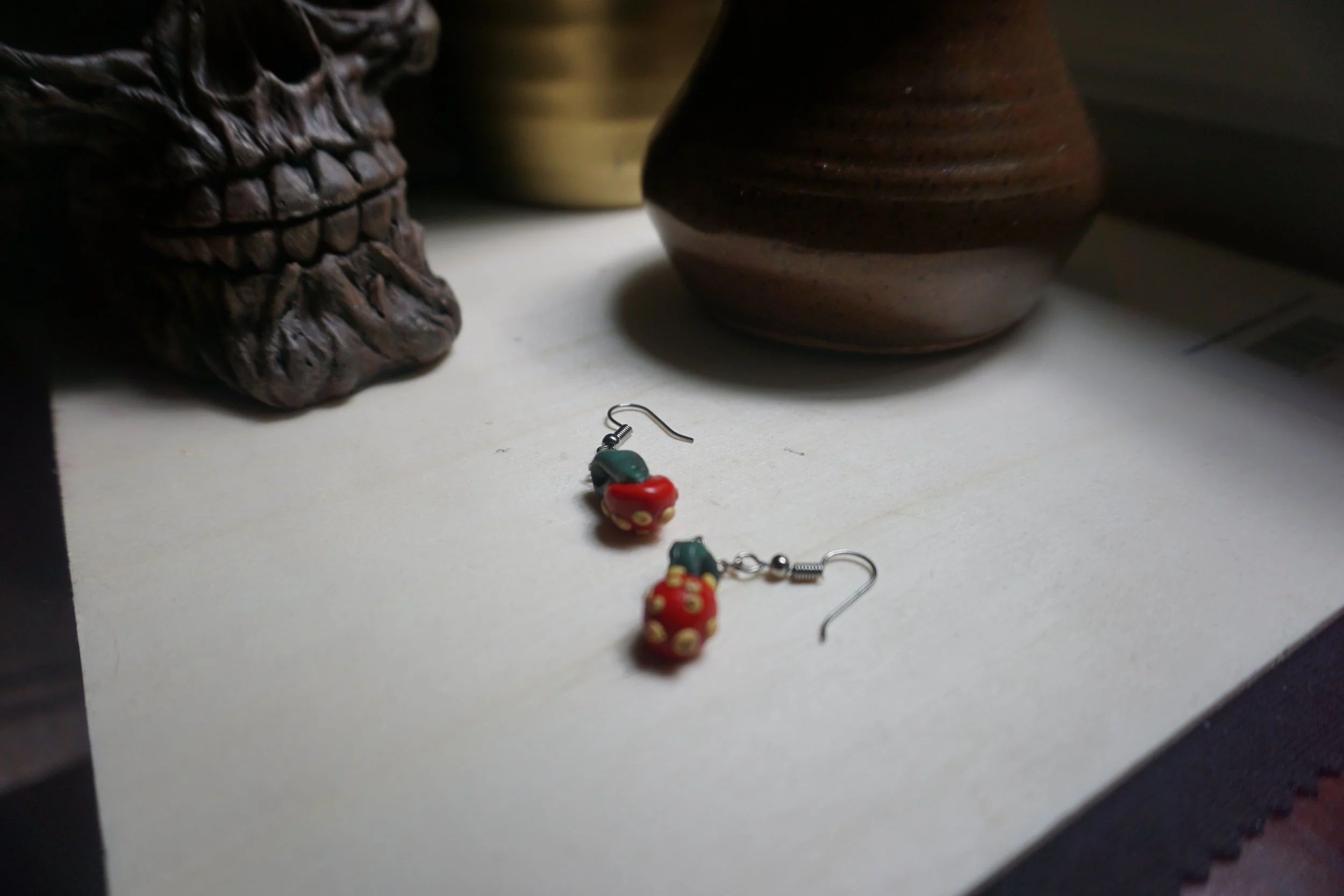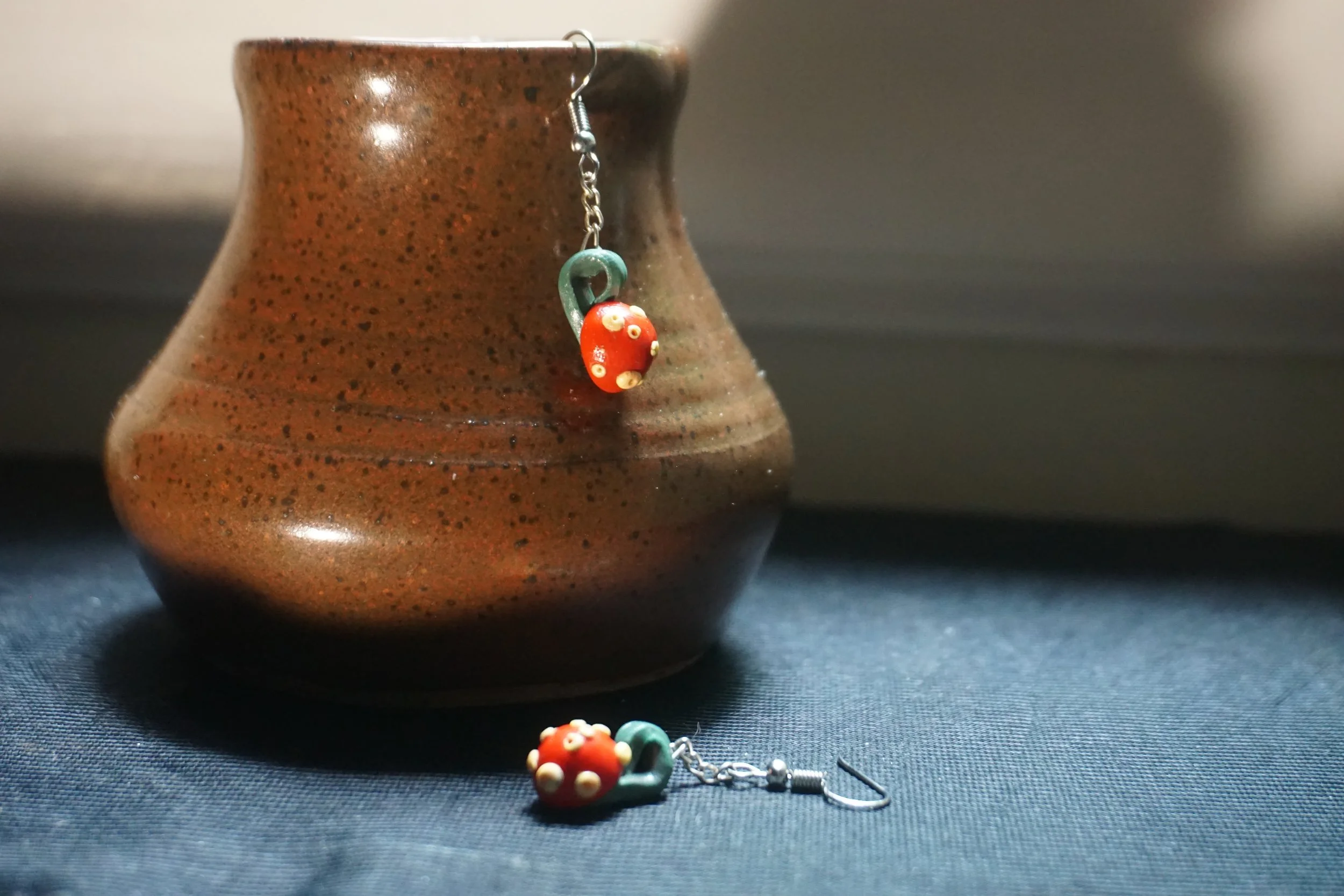 The perfect combination of ornate and cute, bright red berries with raised yellow poka dots. Handmade and hand dotted. Inspired by love and berries. Great with a sun dress or at home in Jammies.